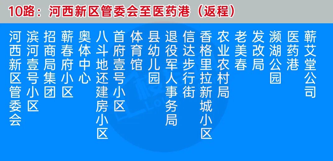 10路:河西新区管委会至医药港(返程)河西新区管委会→滨河壹号小区→招商局集团→蕲春府小区→奥体中心→八斗地还建房小区→首府壹号小区→体育馆→县幼儿园→退役军人事务局→信达步行街→香格里拉新城小区→农业农村局→老美春→发改局→濒湖公园→医药港→蕲艾堂公司