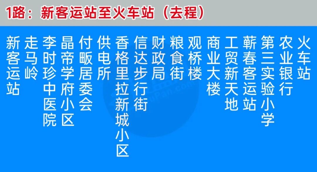 (2023年11月更新)1路:新客运站至火车站(去程)新客运站→走马岭→李时珍中医院→晶帝学府小区→付畈居委会→供电所→香格里拉新城小区→信达步行街→财政局→粮食街→观桥楼→商业大楼→工贸新天地→蕲春客运站→第三实验小学→农业银行→火车站