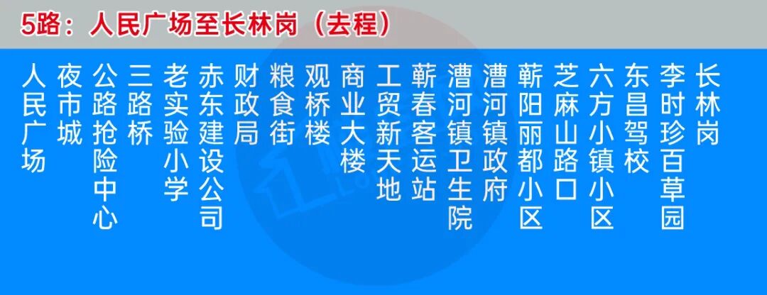 5路:人民广场至长林岗(去程)人民广场→夜市城→公路抢险中心→三路桥→老实验小学→赤东建设公司→财政局→粮食街→观桥楼→商业大楼→工贸新天地→蕲春客运站→漕河镇卫生院→漕河镇政府→蕲阳丽都小区→芝麻山路口→六方小镇小区→东昌驾校→李时珍百草园→长林岗