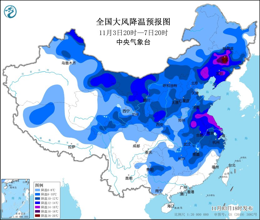 中央气象台3日18时发布寒潮蓝色预警,预计3日20时至7日20时,我国大部地区自西向东将先后出现大风降温天气,新疆北部、西北地区中东部及我国中东部大部地区气温将下降6—10℃,新疆北部、内蒙古西部、西北地区东部、东北地区中南部、黄淮东部、江淮、江南东北部等地气温下降12—14℃,吉林中部等地局地降温可达16℃以上。