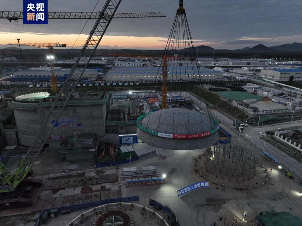 3日,我国陆上商用多用途模块化小型核反应堆“玲龙一号”最后一块钢制安全壳吊装就位,内部结构全面封顶。