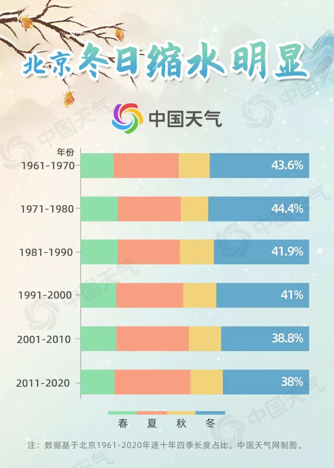 在四季变化中,冬季缩水尤为明显。以北京为例,20世纪六七十年代,平均冬日超过155天,2011年至2020年缩水到139天,冬季在四季中的占比也从44%左右降到38%。