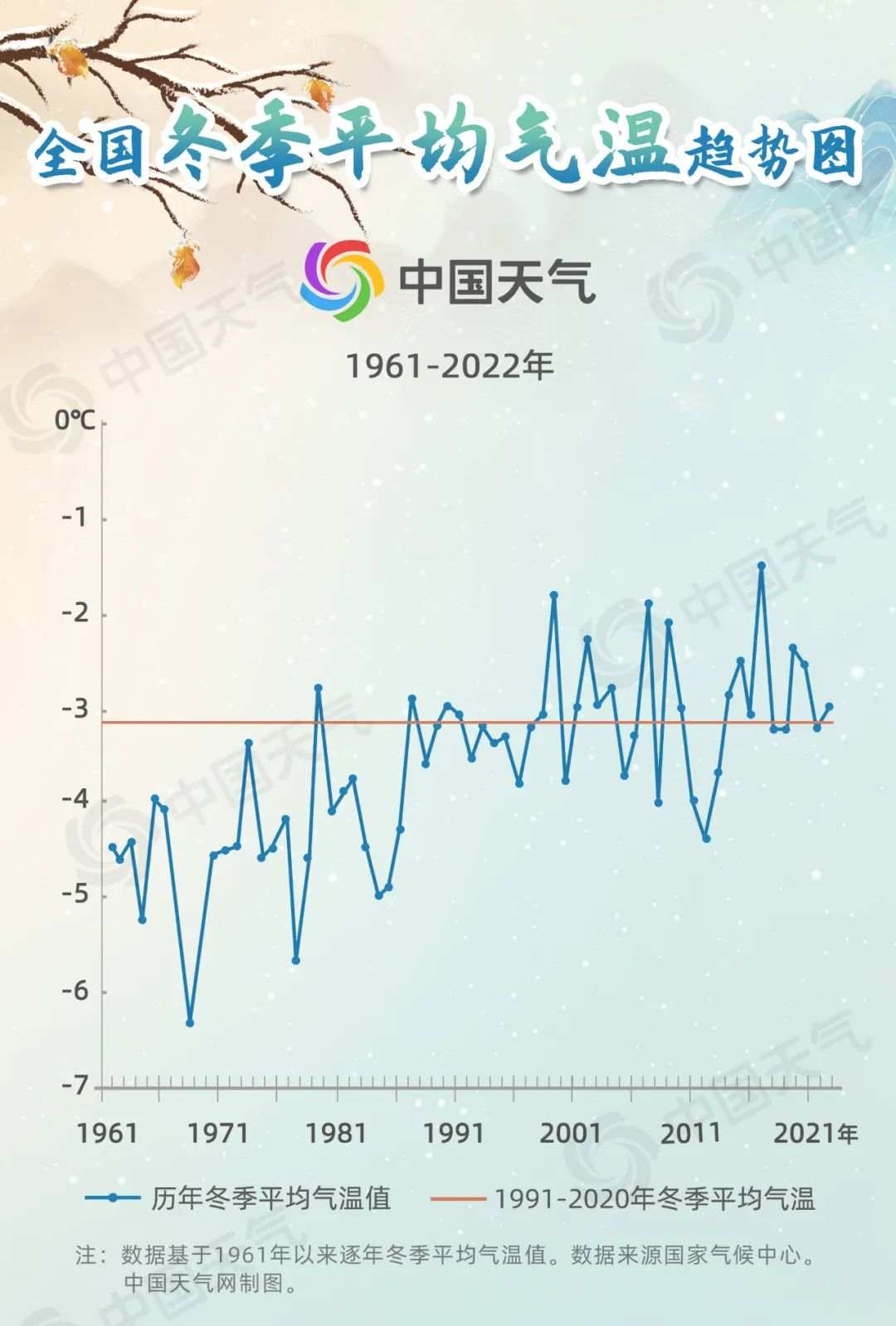 在气候变暖背景下,我国出现暖冬的概率也在增加。从1961年至2022年的统计来看,20世纪90年代后期开始,冬季平均气温超过常年平均值的几率明显加大,尤其最近十年就有七年高于平均值。
