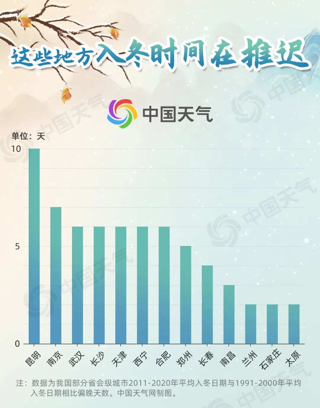 中国天气网盘点大数据发现,不只今年,近六七十年里,我国不少地方的冬季也在逐步推迟。对比20世纪90年代和2011年至2020年近十年的平均入冬时间,昆明推迟10天,南京、合肥、武汉等地从11月中旬推迟到11月下旬,延迟超过5天,此外,杭州、长春、南昌等城市的冬季也比之前晚了3到5天。