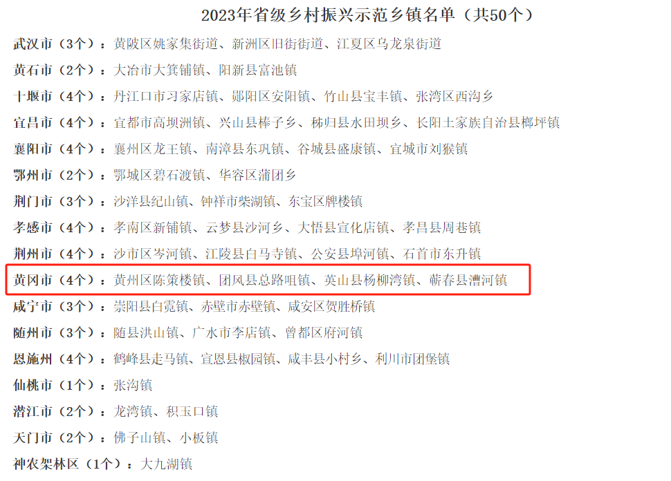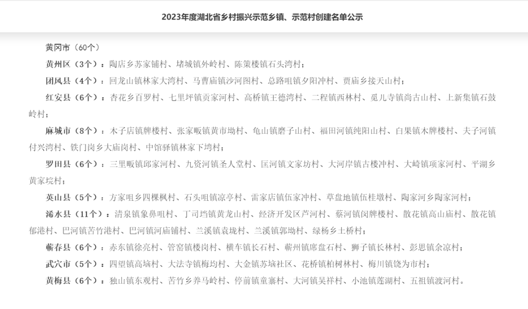 湖北省农业农村厅、省乡村振兴局组织开展了2023年度全省乡村振兴示范乡镇、示范村创建工作。黄冈市4个乡镇、60个村上榜!