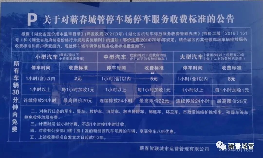 根据《湖北省定价成本监审目录》(鄂发改规[2021]3号)、《湖北省机动车停放服务收费管理办法》(鄂价工服〔2016〕151号)和《湖北省政府制定价格行为规则实施细则》的通知(鄂价法规(2014) 70号)等规定,机动车停放服务收费标准实行政府定价管理,现根据《关于蕲春城管公共停车场车辆停放服务收费标准的批复》(蕲发改〔2023〕43号)公示如下: