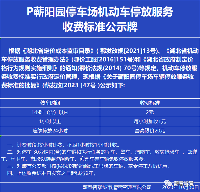 根据《湖北省定价成本监审目录》(鄂发改规[2021]3号)、《湖北省机动车停放服务收费管理办法》(鄂价工服〔2016〕151号)和《湖北省政府制定价格行为规则实施细则》的通知(鄂价法规(2014) 70号)等规定,机动车停放服务收费标准实行政府定价管理,现根据《关于蕲阳园停车场车辆停放服务收费标准的批复》(蕲发改〔2023〕47号)公示如下: