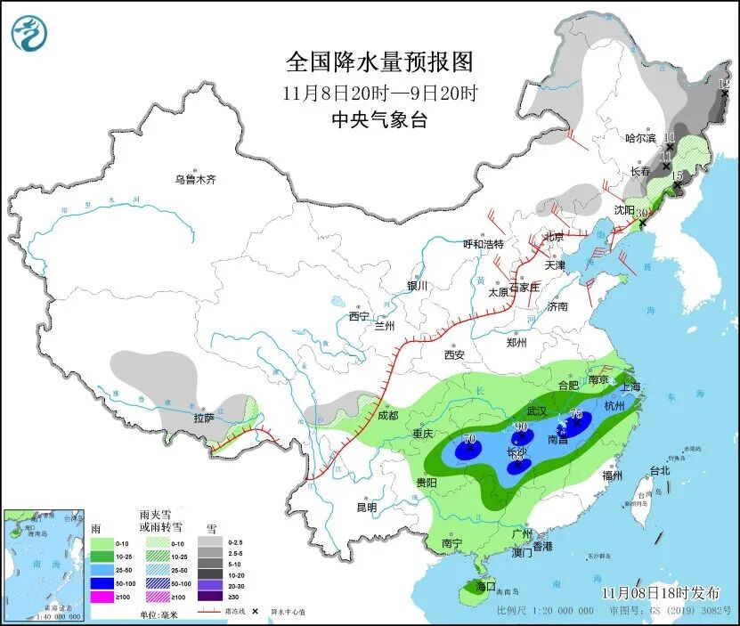 中央气象台预计,11月8日20时至9日20时,贵州东部、重庆东南部、湖北东部、湖南大部、苏皖南部、江西中北部、浙江中北部、上海、福建西北部以及广西东北部等地部分地区有中到大雨,其中,贵州东北部、湖南西北部和东部、江西东北部等地部分地区有暴雨。