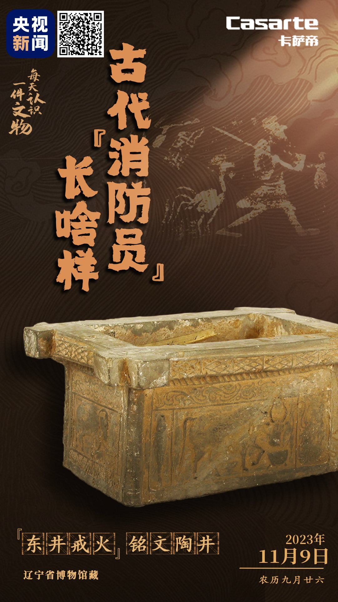 “东井戒火”铭文陶井,四壁均刻有人物和动物图案,形态逼真,线条流畅。这口2000年前的“消防井”,前壁印“戒火”“东井”篆书榜题;中心图案上,一男子右肩扛旗,旗上有“戒火”二字,左⼿执⼀物,有⼈认为是⽔罐,据推断很可能是当时的“专职消防员”。