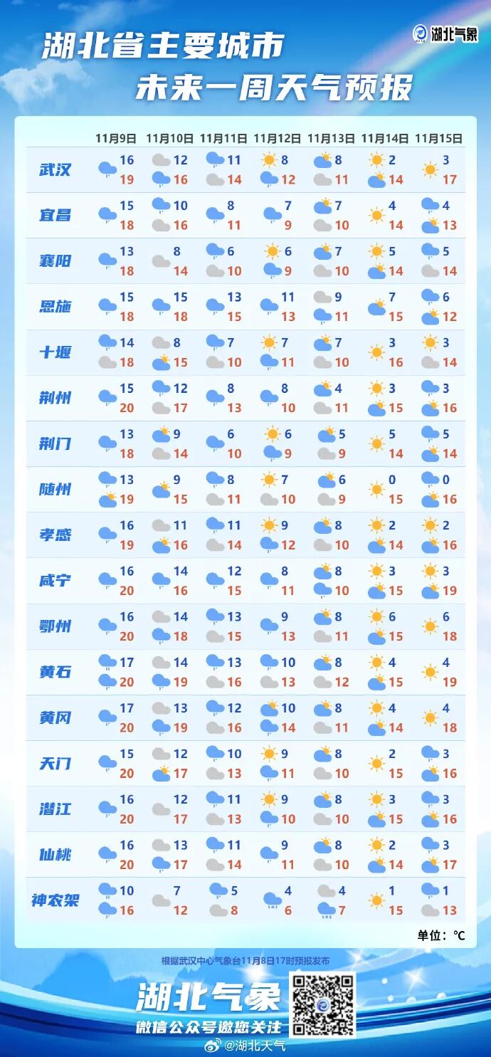 此外,从湖北主要城市一周预报可以看到,13日起,受新的冷空气影响,省内各主要城市气温还将有不同程度的下降。14日武汉最低气温仅有2℃,随州14-15日最低气温降至0℃。