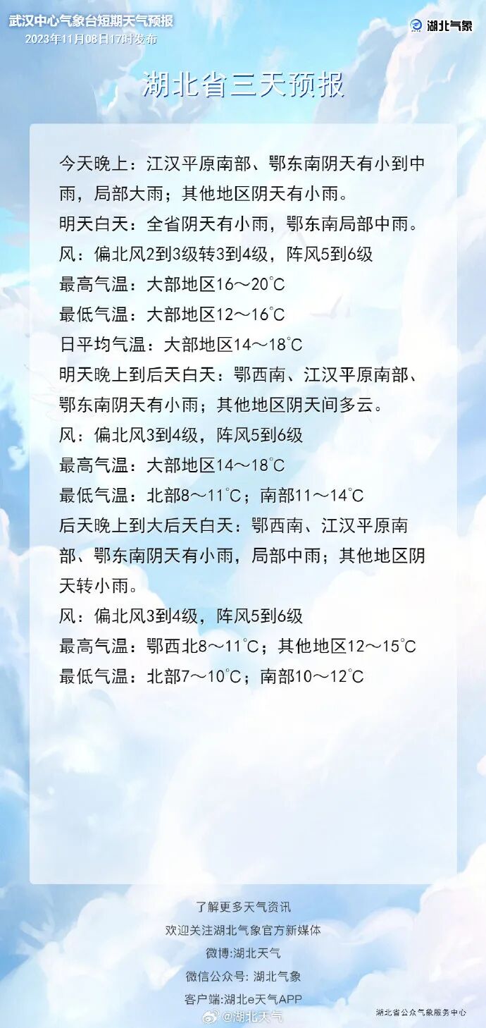 据湖北省气象最新消息,预计8日晚起到10日,我省大部地区有降水发生并伴有大风降温天气。