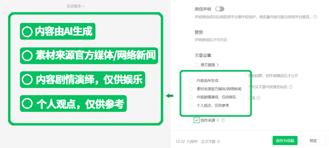 微信绿色、安全的平台生态离不开广大“自媒体”创作者的共同构建,为进一步规范“自媒体”创作行为,加强对不实信息的治理,根据《关于加强“自媒体”管理的通知》(以下简称《通知》)要求,“自媒体”创作者应主动对发布内容进行规范标注。