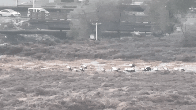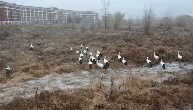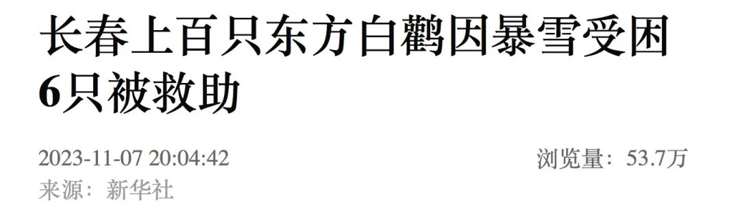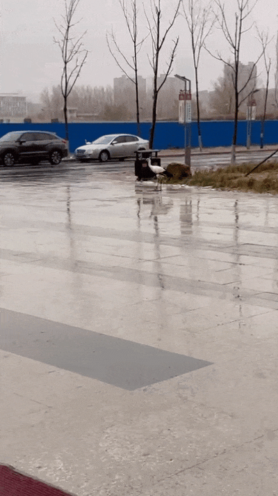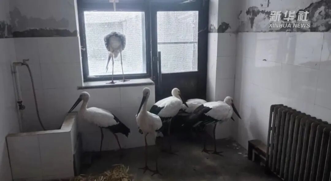 迁徙中的东方白鹳被大雪打湿翅膀,