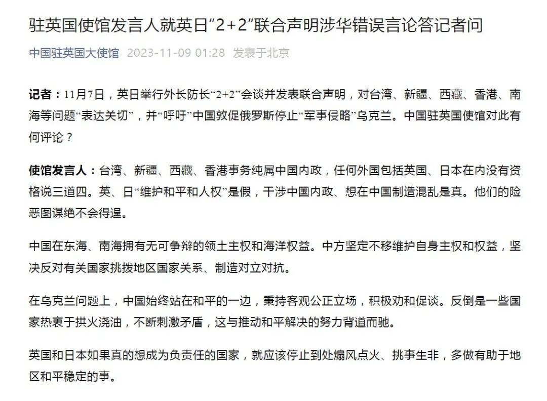 驻英国使馆发言人就英日“2+2”联合声明涉华错误言论答记者问