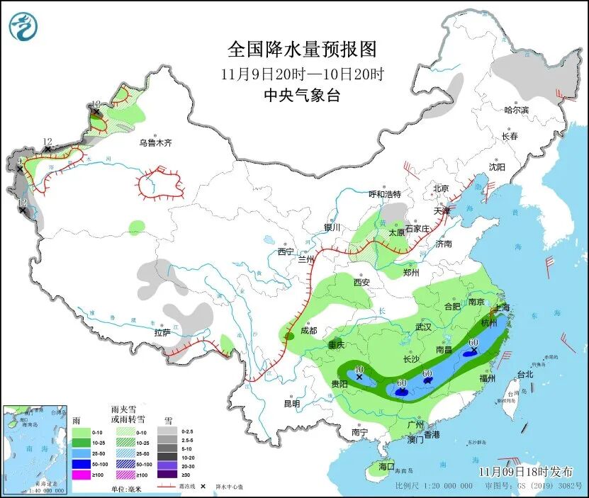 中央气象台预计,9日20时至10日20时,新疆、西藏、青海、内蒙古、黑龙江、山西等地部分地区有小到中雪或雨夹雪,其中,新疆西部山区等地部分地区有大雪或暴雪。贵州、广西、广东、湖南、江西、福建、浙江等地部分地区有中到大雨,其中局地有暴雨。