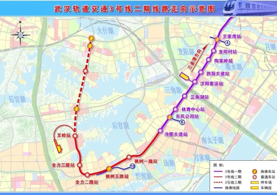 武汉轨道交通3号线二期项目起于文岭站,起点预留向北延伸条件,止于沌阳大道站(不含),全长12公里,设站5座(枫树一路站、枫树五路站、全力二路站、全力三路站、文岭站),全线地下,平均站间距约2.4公里。