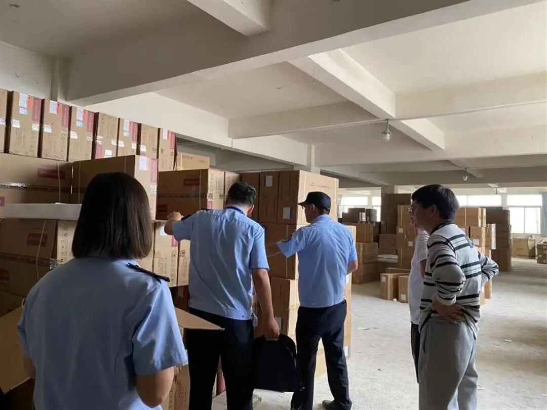 ↑执法人员在仓库中发现大量未备案的燃气器具