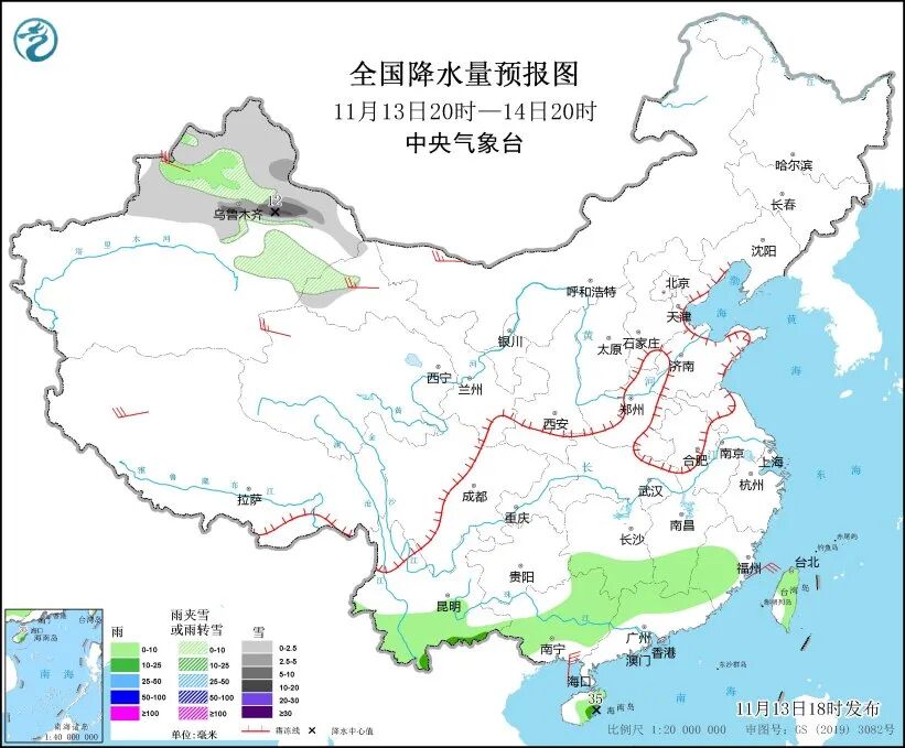 中央气象台预计,13日20时至14日20时,新疆北部、甘肃河西等地部分地区有小到中雪或雨夹雪,其中新疆沿天山地区局地有大到暴雪。云南南部、江南南部、华南大部等地部分地区有小到中雨,其中海南东部局地有大雨。新疆北部、西藏北部、内蒙古西部、甘肃北部、青海西部等地部分地区有5~7级风。