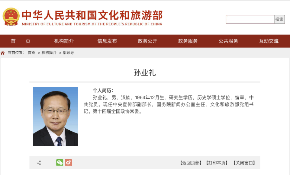 据文化和旅游部官网“部领导”栏目显示,孙业礼已任文化和旅游部党组书记。