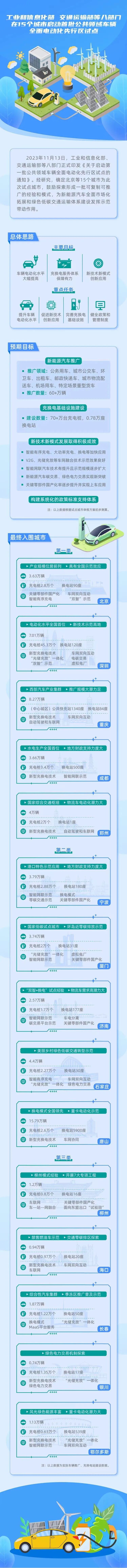 工业和信息化部、交通运输部等八部门13日正式印发《关于启动第一批公共领域车辆全面电动化先行区试点的通知》。经研究,确定北京、深圳、重庆、成都、郑州等15个城市为此次试点城市,鼓励探索形成一批可复制可推广的经验和模式,为新能源汽车全面市场化拓展和绿色低碳交通运输体系建设发挥示范带动作用。