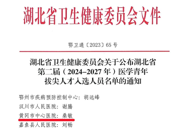 湖北省卫生健康委员会公布,“湖北省第二届(2024—2027年)医学青年拔尖人才”入选人员名单,黄冈市中心医院生殖医学科主任桑敏光荣上榜,成为黄冈市唯一入选本届“医学青年拔尖人才”的医务人员。