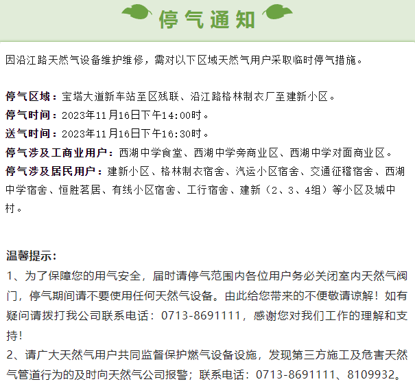 因沿江路天然气设备维护维修,需对宝塔大道新车站至区残联、沿江路格林制衣厂至建新小区等区域天然气用户采取临时停气措施。停气时间:2023年11月16日下午14:00时。