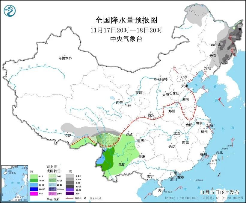 中央气象台预计,17日20时至18日20时,内蒙古东北部、黑龙江西北部和东部、吉林东部、辽宁东北部、西藏东部、川西高原等地部分地区有小到中雪或雨夹雪,其中,黑龙江东部、吉林东部等地部分地区有大到暴雪,局地有大暴雪。四川盆地南部、西藏南部、云南大部、贵州西部等地部分地区有小到中雨,其中,云南西部有大雨。