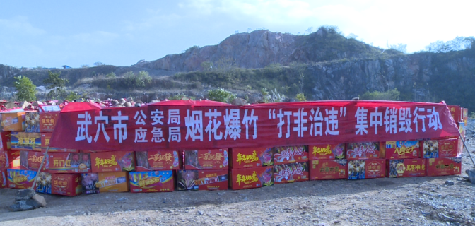 日前,武穴市将今年收缴的涉案非法烟花爆竹运送到九牛山废矿区进行集中销毁处理,共计销毁非法烟花爆竹成品5123件。