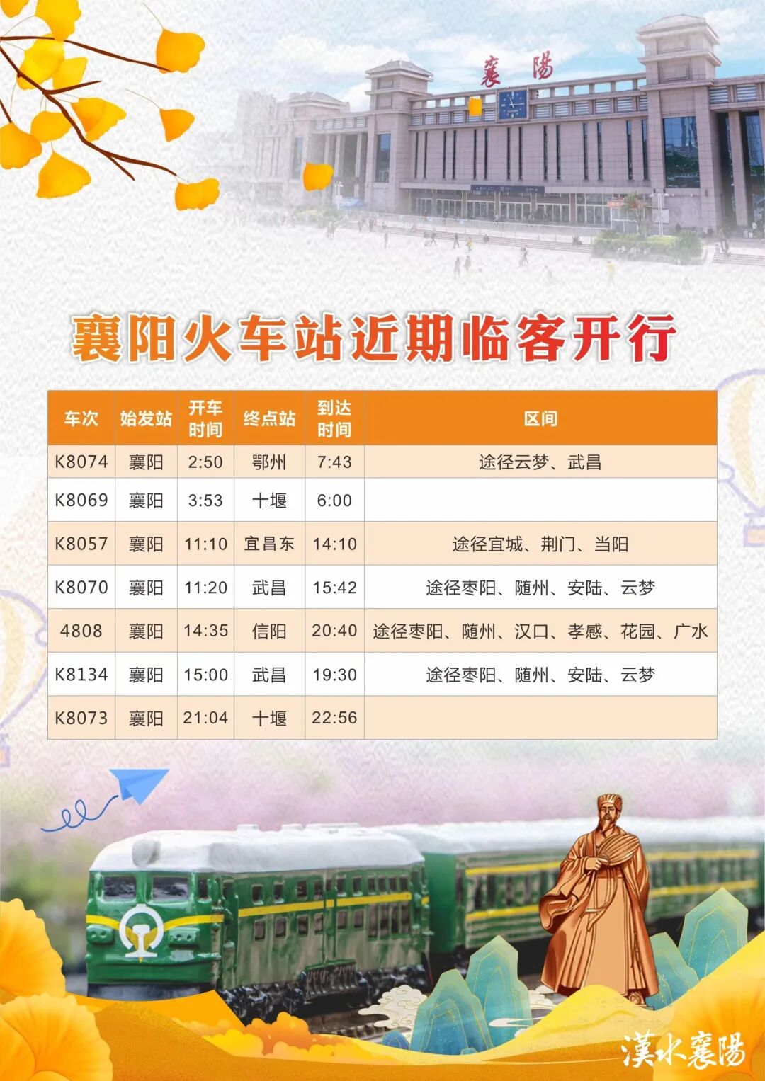 K8132次武昌至襄阳,11月18日起至27日开行。途径云梦、安陆、随州、枣阳。