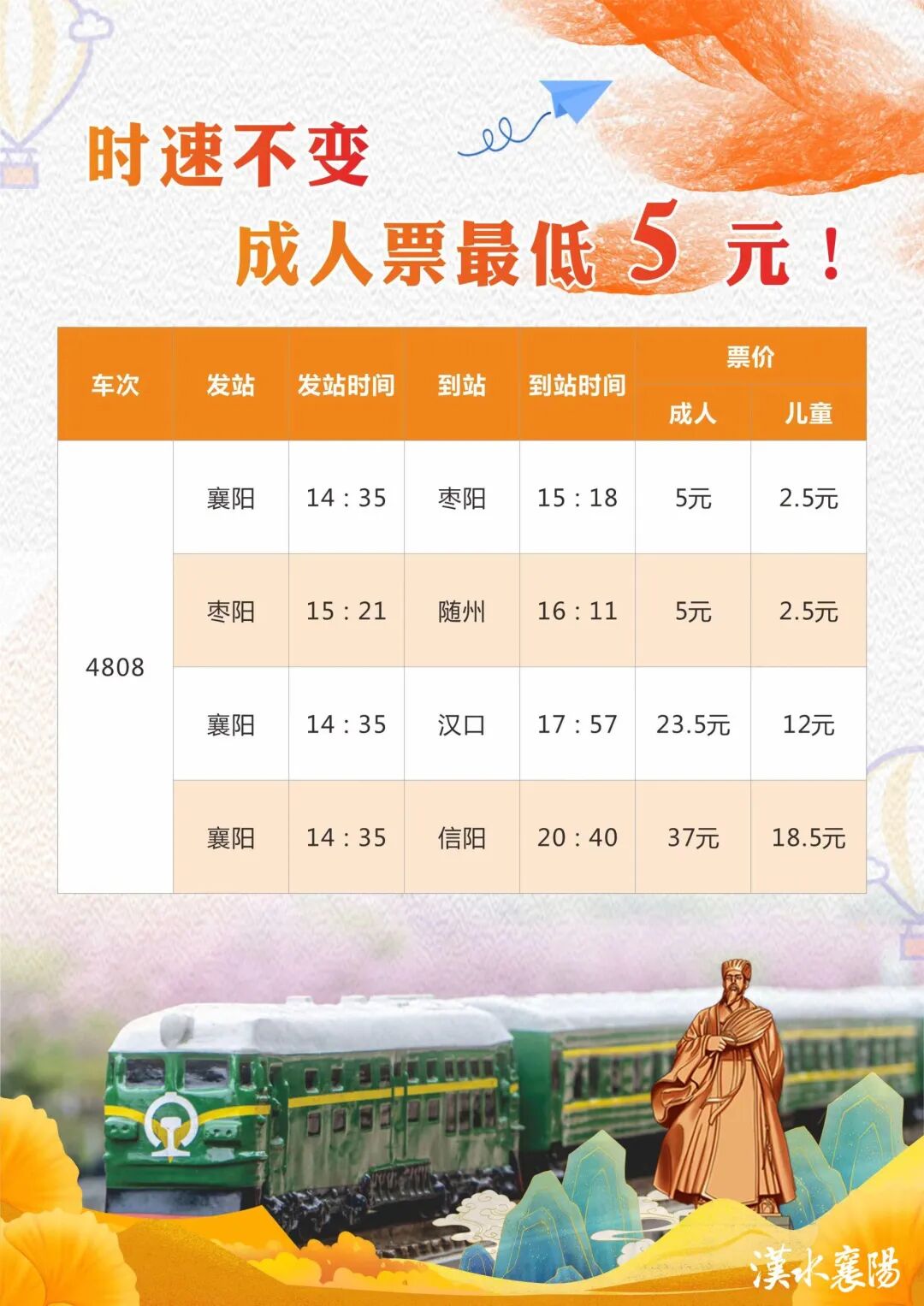 日前襄阳火车站加开多趟临时旅客列车便于旅客出行其中,14时35分从襄阳始发终到信阳的4808次到枣阳仅需5元