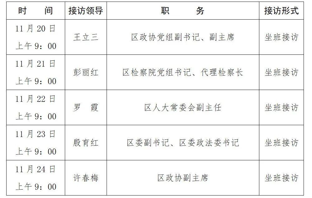 4.如遇区领导工作冲突,区信访局将进行临时调整。