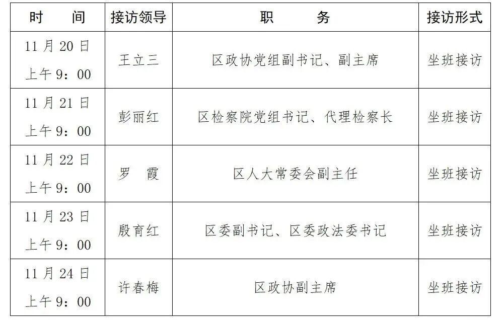 11月份第四周黄州区领导接访安排公示如下:
