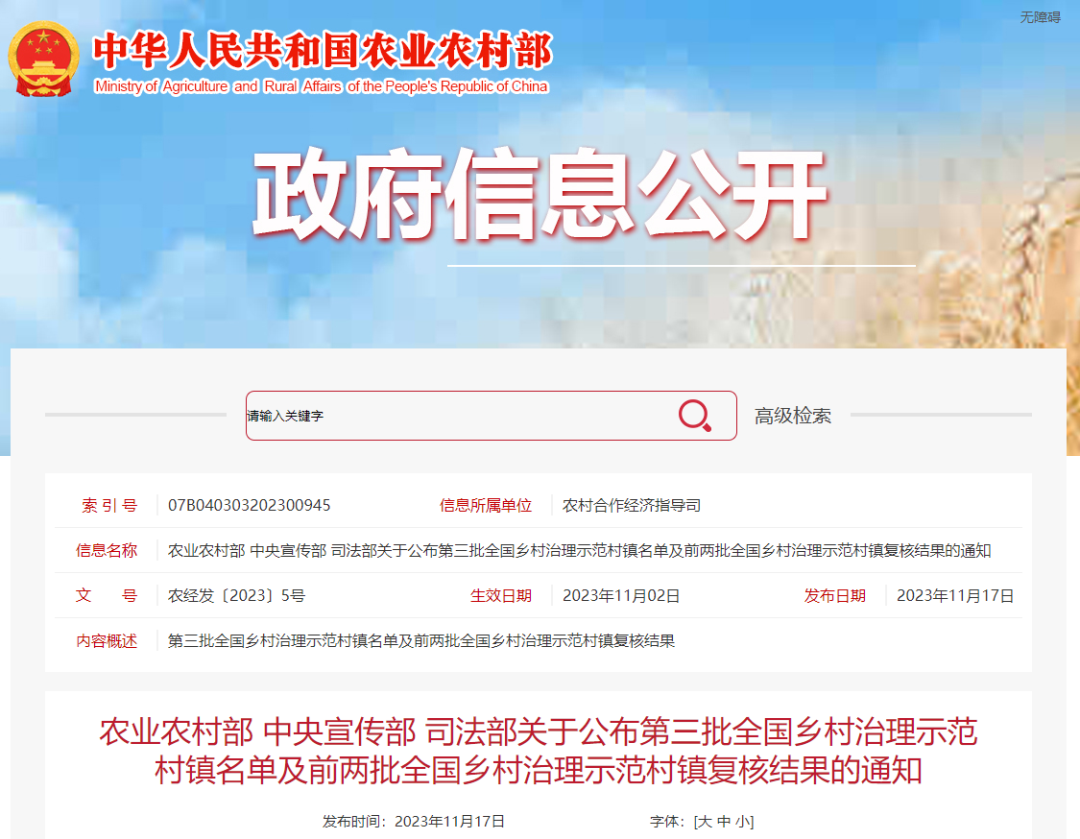 农业农村部 中央宣传部 司法部关于公布第三批全国乡村治理示范村镇名单及前两批全国乡村治理示范村镇复核结果的通知