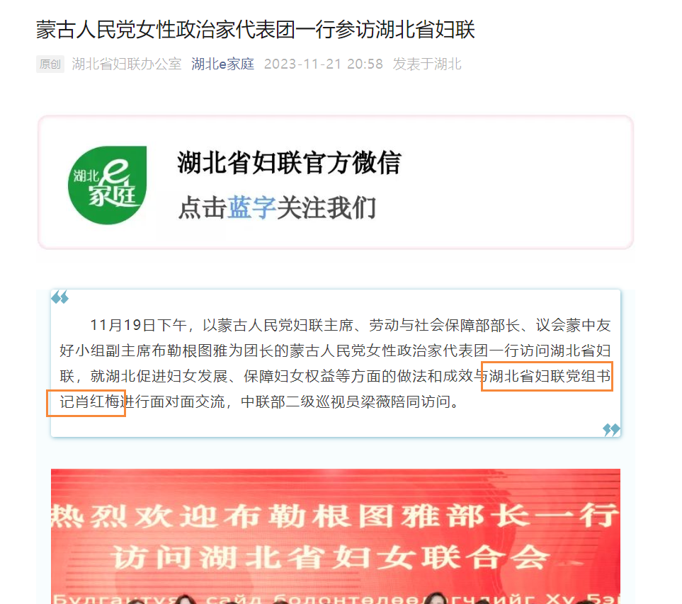 据湖北省妇联官方微信公众号11月21日消息。11月19日下午,以蒙古人民党妇联主席、劳动与社会保障部部长、议会蒙中友好小组副主席布勒根图雅为团长的蒙古人民党女性政治家代表团一行访问湖北省妇联,就湖北促进妇女发展、保障妇女权益等方面的做法和成效与湖北省妇联党组书记肖红梅进行面对面交流,中联部二级巡视员梁薇陪同访问。