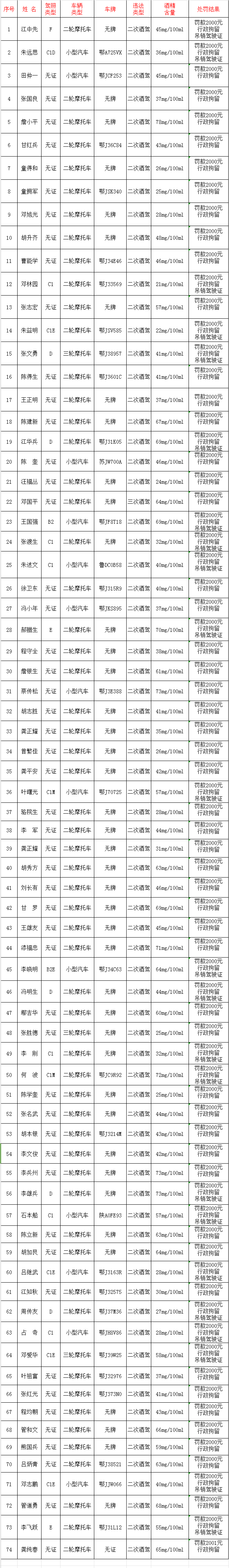 为深入推进冬季突出违法行为专项整治行动,蕲春公安交警按照“白+黑”不定期查、周末全县集中查的模式,持续保持对酒醉驾严管高压态势,严防涉酒恶性事故发生,防范化解冬季交通安全风险隐患,但总有人把蜀黍的告诫当做耳边风,屡禁不止。现将2023年7至10月份被查获的二次酒驾和醉驾人员予以曝光,请广大驾驶人引以为戒,切勿心存侥幸,以身试法!