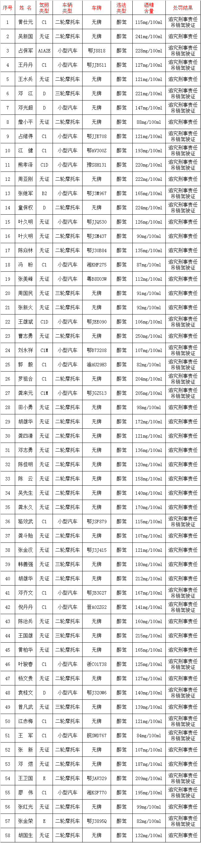醉酒驾驶(58人)