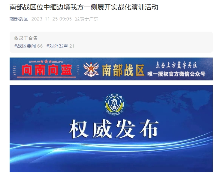 据“南部战区”微信公众号消息,中国人民解放军南部战区新闻发言人田军里空军大校表示,根据年度训练计划,中国人民解放军南部战区组织陆军部队于11月25日起,位中缅边境我方一侧举行实战化演训活动,旨在检验战区部队快速机动、边境封控、火力打击能力。