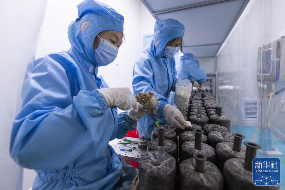 11月23日,在湖北省罗田县九资河镇葫芦石村,技术人员在无菌室对天麻菌种进行液体接种。