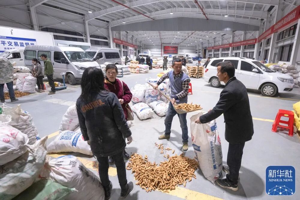 11月23日,在湖北省罗田县九资河镇大别山道地药材产业园鲜货交易市场,客商在收购药农的天麻。