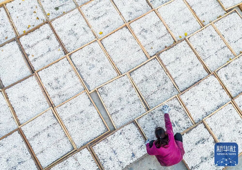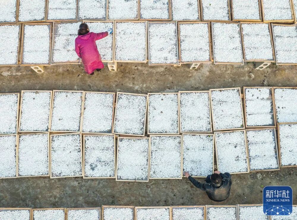 11月23日,在湖北省罗田县九资河镇天堂湖村,药农在晾晒茯苓(无人机照片)。