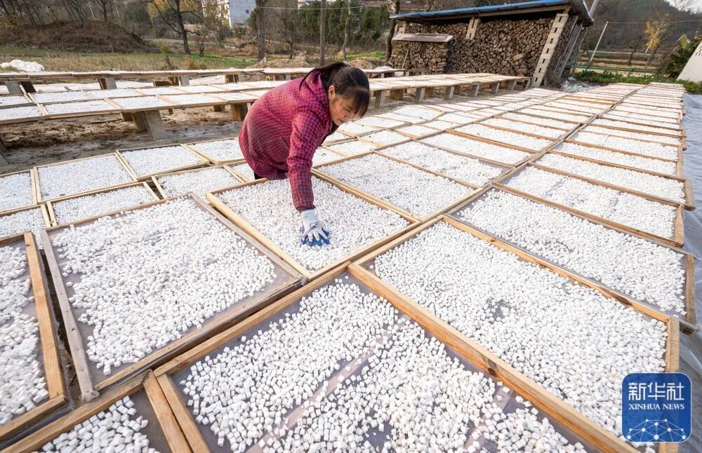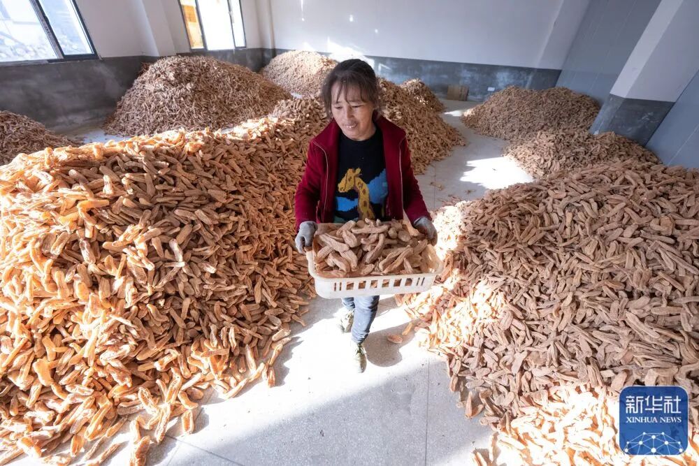 11月23日,在湖北省罗田县九资河镇葫芦石村,药农在整理晾晒的天麻。