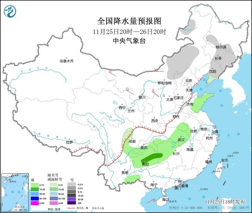 中央气象台预计,25日20时至26日20时,内蒙古中东部、黑龙江南部、吉林中东部、辽宁中东部、山东半岛北部等地部分地区有小雪或雨夹雪。黄淮东部、江汉东部、江南西部、西南地区东部、云南东南部等地部分地区有小雨,其中,贵州中东部、湖南西部等地部分地区有中雨。
