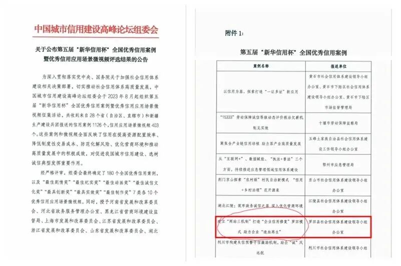 由罗田县社会信用体系建设领导小组办公室报送、罗田县人民法院法院参与创建的《建立“两站三机制” 打造“企业信用修复”罗田模式 助力企业“造血再生”》成功入选全国优秀信用案例。