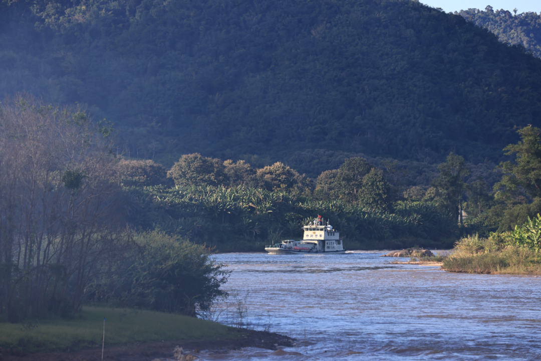 ▲联合巡逻执法编队经过湄公河孟喜岛水域。(李朋飞 摄)