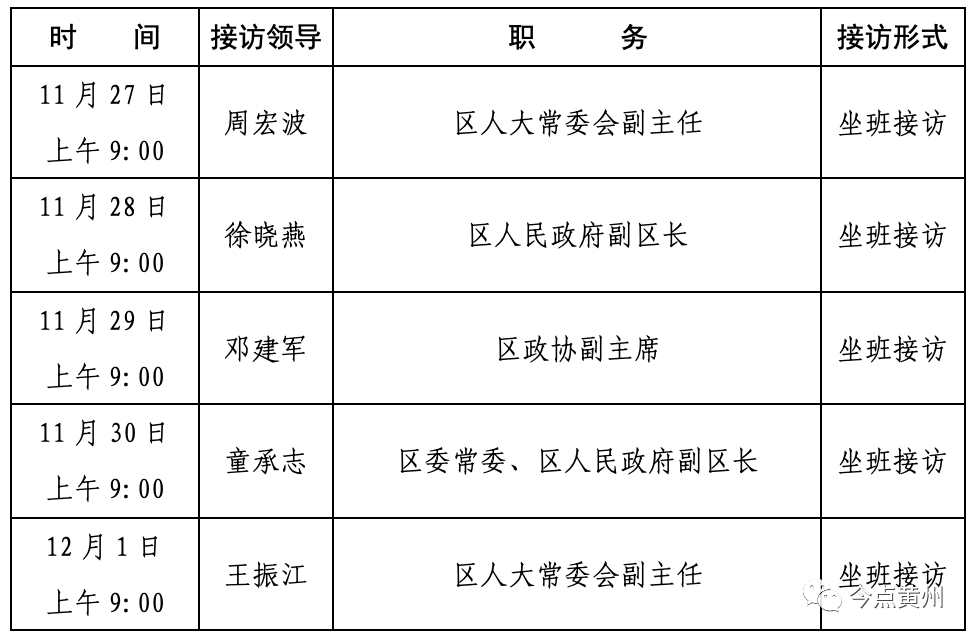 为深入践行党的群众路线,加强和改进人民信访工作,进一步畅通信访渠道,依法及时就地解决群众合理诉求,根据工作安排,黄州区公示11月份第五周领导接访安排。群众可在工作日拨打电话:0713-8354573进行预约。