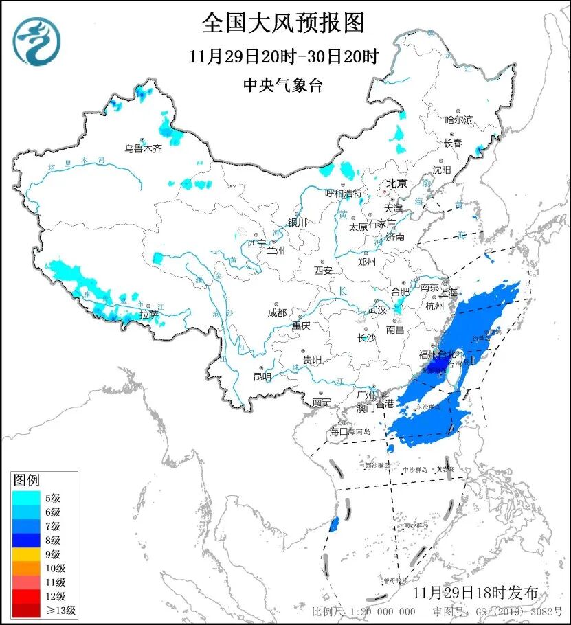 中央气象台29日18时继续发布大风蓝色预警,预计29日20时至30日20时,新疆北部、西藏南部、内蒙古中东部及我国东南沿海地区将有5—6级、阵风7—9级的大风。