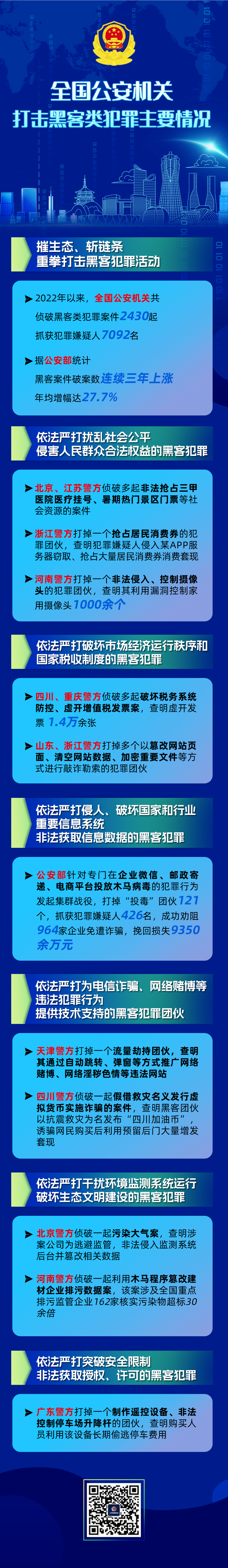 在全球数字经济时代,网络技术给人民群众的生产生活带来了前所未有的便利,也带来了前所未有的风险,其中衍生出了以网络空间为场地、以网络技术为手段、以信息系统和数据为目标的黑客犯罪。公安部高度重视黑客犯罪,部署全国公安机关持续开展“净网”专项行动,摧生态、斩链条,重拳打击黑客犯罪活动。据通报,2022年以来,全国公安机关共侦破黑客类犯罪案件2430起、抓获犯罪嫌疑人7092名,有效斩断了以黑客犯罪为核心的黑产链条,切实保障了网络与数据安全,有力维护了网络空间正常秩序。