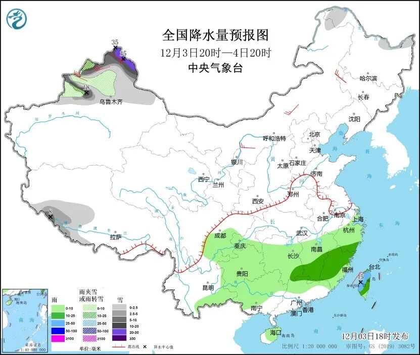中央气象台预计,3日20时至4日20时,新疆北部、西藏南部等地部分地区有中到大雪或雨夹雪,其中,新疆阿勒泰山区及沿天山地区等地有暴雪或大暴雪,局地特大暴雪。西南地区东部、江南、华南北部、台湾岛等地部分地区有小到中雨,其中,台湾岛中北部等地有大雨。