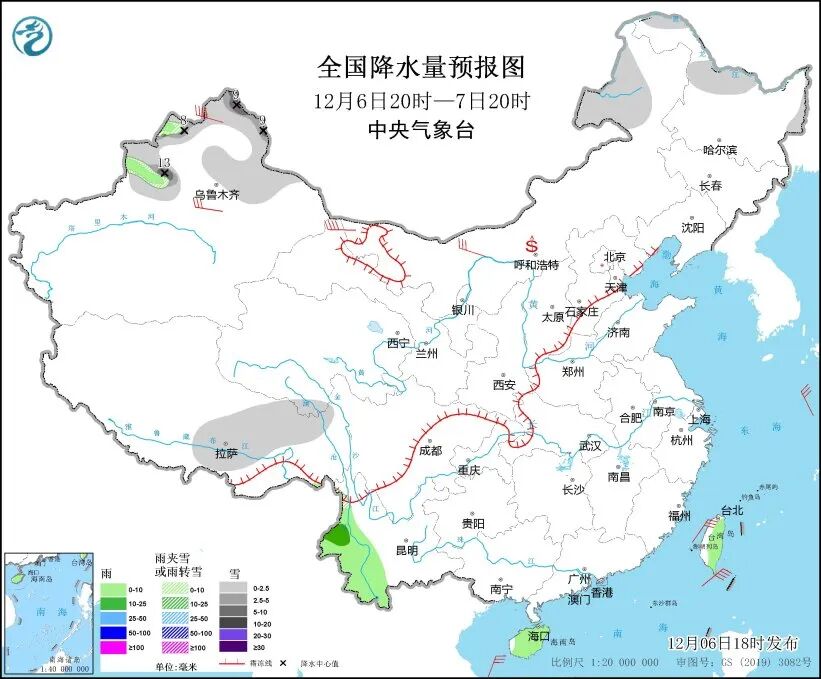 中央气象台预计,6日20时至7日20时,内蒙古东北部、黑龙江北部、新疆北部、西藏南部和东部等地部分地区有小雪或雨夹雪,其中,新疆北疆北部东部等地部分地区有中到大雪,伊犁河谷局地暴雪。云南西南部、海南岛、台湾岛等地部分地区有小到中雨。