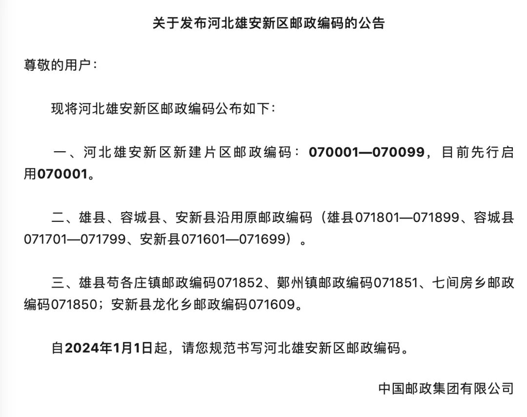 中国邮政集团有限公司6日发布:自2024年1月1日起,河北雄安新区新建片区邮政编码为070001—070099,目前先行启用070001。